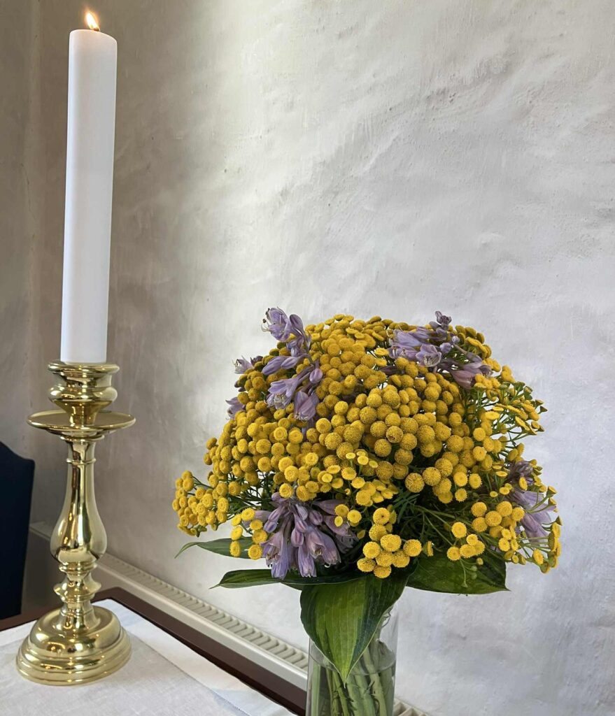 Og sĂĄ springer jeg lige til gĂĄrsdagens gudstjeneste – for pĂĄ alteret i Filskov kirke stod denne fine buket. Rejnfan plukket i vejkanten – som graveren sagde, “der var sĂĄ mange”, – og de lyste op og satte spot pĂĄ skaberværket.