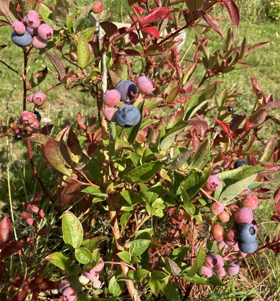 BlĂĄbærrene er ogsĂĄ godt pĂĄ vej. De trives tilsyneladende godt nok i min hjemmelavede skovbund. Jeg vil ikke købe spagnum, sĂĄ i stedet er der masser af blade, grangrene og nĂĄle og kogler i jorden rundt om de to buske. Og lækkert er det – lige at kunne plukke et blĂĄbær pĂĄ vej forbi buskene – det er noget af det jeg drømmer om, at en have kan. Give lidt frugt med pĂĄ vejen.