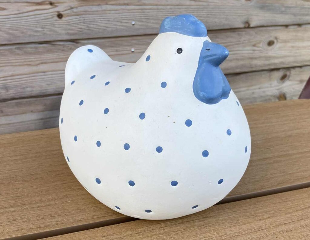 Og udenfor er den første høne flyttet ind 🙂 desværre trækker den ikke vejret, men den ser da super sød ud. Hun stod i Genbrug forleden, og den måtte jeg da bare eje. Nu venter hun så på, at der kommer rigtige høns i haven. Det bliver så godt 🙂