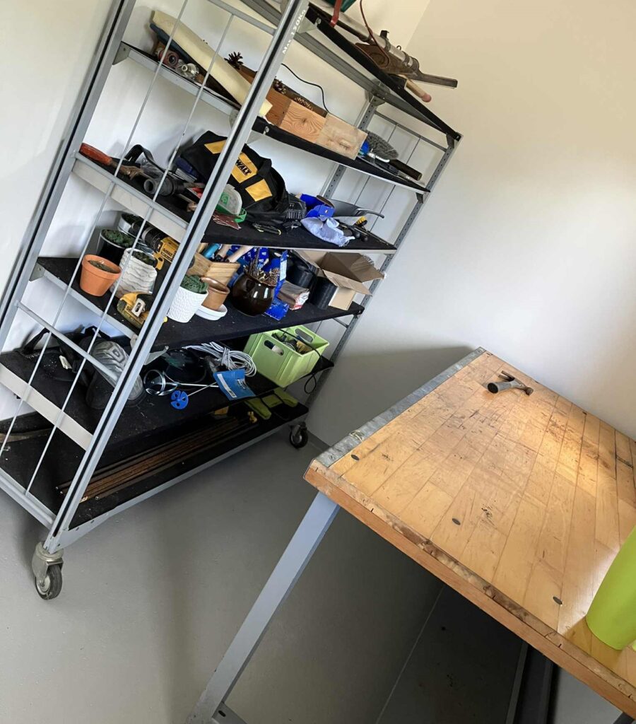 Og inden døre i det lille hus, sĂĄ kommer der flere og flere ting ind. For der er kommet en deadline – 1. oktober skal vi være ude af Oles hus, og altsĂĄ for alvor flytte ind her i huset 🙂 Og det er et lille hus, sĂĄ der kommer udfordringer undervejs – i det lille værksted mĂĄ reol og arbejdsbord kæmpe om pladsen 🙂 Der skal nok pĂĄ sigt rykkes noget rundt.