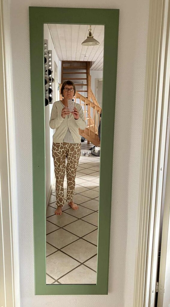 I processen med at sortere og vurdere, hvad skal flytte med og hvad skal sælges eller gives til genbrug – så faldt jeg over Oles store spejl i gangen. Det er ret fint, og det er lidt smart ind i mellem at have et spejl, hvor man kan se hele sig selv 🙂 Men jeg var ikke så begejstret for den mørke ramme, der var udenom.