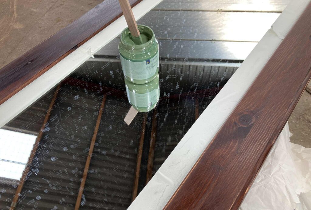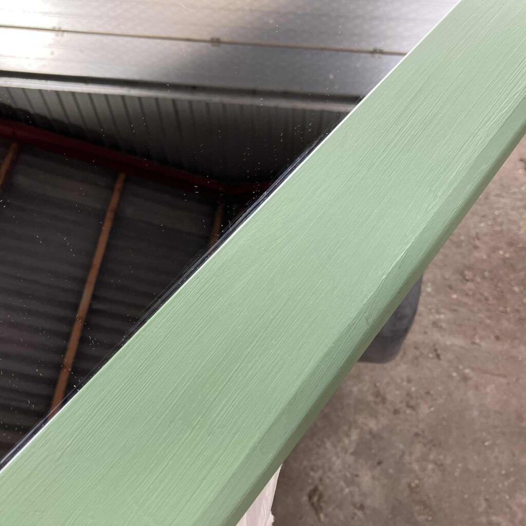 Så fik rammen to gange med den bambus grønne maling. Og det tørrede enormt hurtigt op, så allerede efter en time kunne males anden gang. Og efter endnu en times tid kunne jeg give det en omgang voks. Så malingen blev lidt mere modstandsdygtig.
