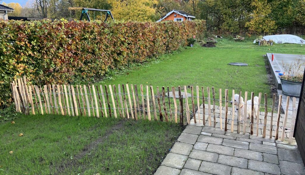 Jeg har længe gerne villet have et kastanjehegn – jeg synes, de er fine og rustikke på samme tid. De kan købes højere end det, jeg har valgt. Til gengæld kan jeg fint skræve hen over det – indtil der på sigt kommer en eller anden låge i. Indtil videre kan det åbnes ved at løsne en elastik 🙂