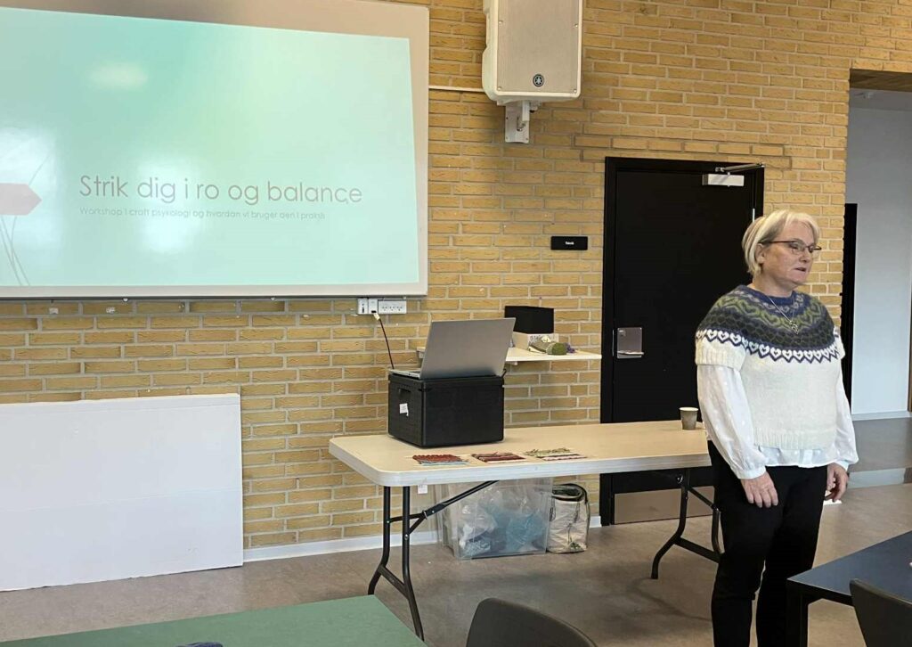 Underviser var Mette Albæk, tidligere sygeplejerske, men nu uddannet i craft-psykologi og indehaver af et web-butik og garnlager i Nordjylland.