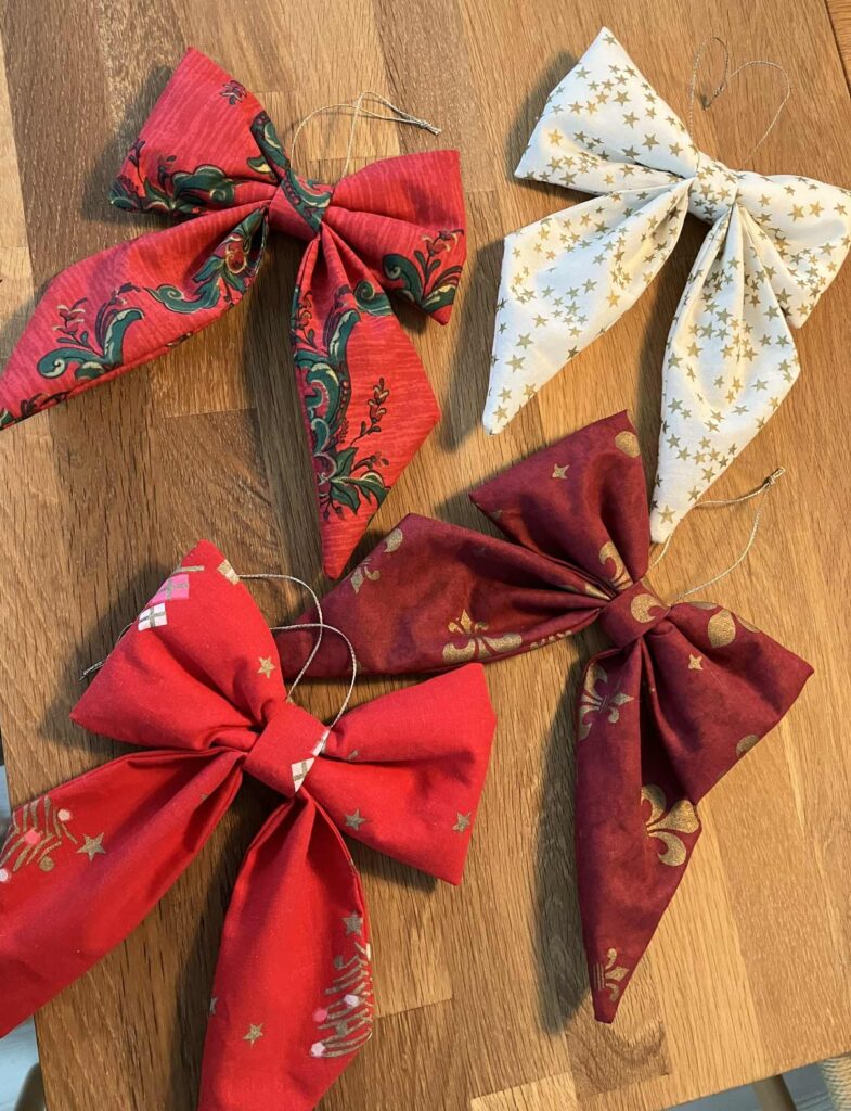 Jeg er vist flere år bagefter den her slags julepynt – sløjfer syet i stof 🙂 Men jeg har dog set, at de også i år kan købes i butikker. Men nu har jeg fået syet de første selv. Og er ret begejstret. De er forholdsvis lette at lave og ser bare fine og elegante ud, når de først er kommet op at hænge.