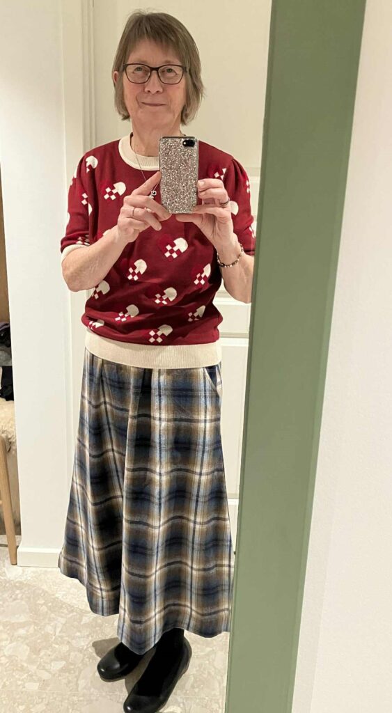 Og så har jeg i år købt juletøj 🙂 Nettet har vist, at julesweatre er in. Julesokker ligeså. Men virkelig meget kommer fra Kina – og er i tvivlsom kvalitet. Så udfordringen var at finde noget, hvor materialet var i orden. Og det lykkedes – så både bluse og nederdel er økologisk og certificeret – og jeg befinder mig så godt i begge dele 🙂