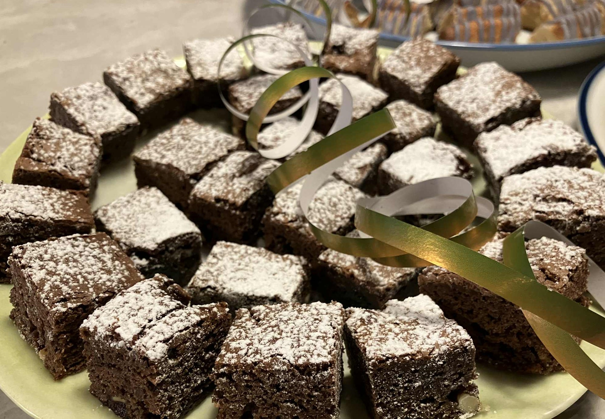 Jeg havde tilbudt at medbringe desserten til festen – og lavede kage-tapas. Små stykker kage med hver deres smag – men i år med et violet skær 🙂 uden egentlig nogen anledning. Det blev bl.a. min nøddetærte, som ses øverst. Den smager bare altid godt.