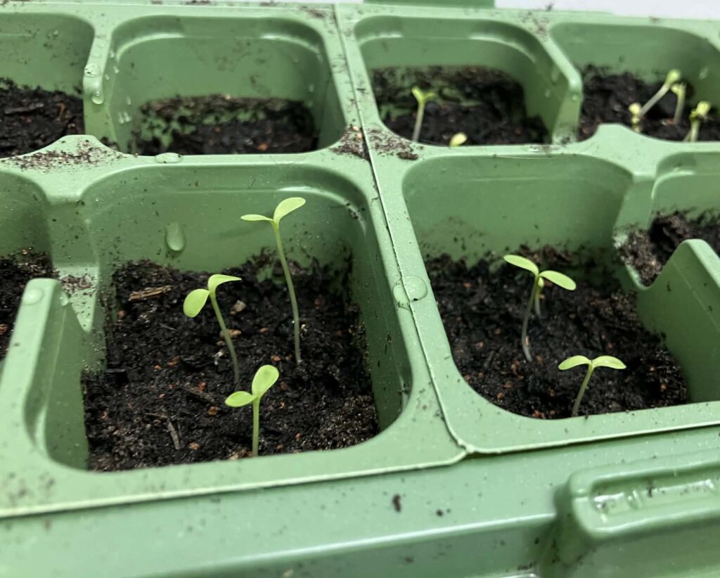 Så nu er der kommet så-jord i de små huller (jorden er også indkøbt efter nøje granskning af, hvad det er :-)) Der er blevet vandet og trykket lidt på jorden, der kom plastik låg på toppen, og så stod bakkerne inde i stuen – og jeg ventede.