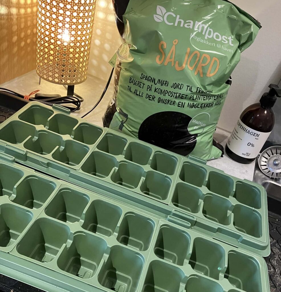 Først havde jeg tænkt, at jeg skulle forspire i gamle æggebakker – men så blev jeg alligevel grebet af stemningen og købte mig et sæt spirebakker. Som jeg regner med at kunne genbruge til næste år.